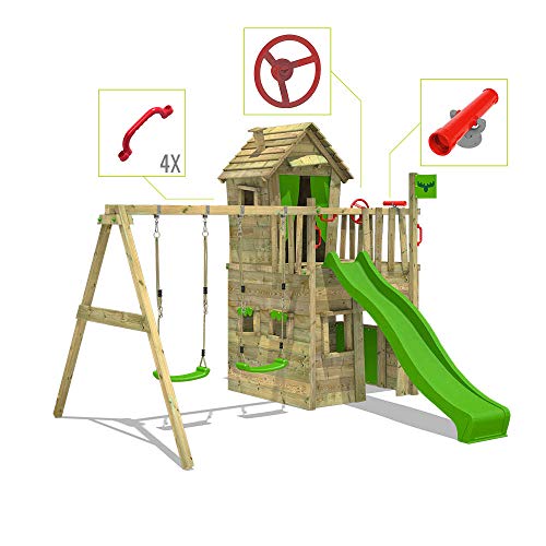 FATMOOSE Spielturm Klettergerüst CrazyCat mit Schaukel & apfelgrüner Rutsche, Spielhaus mit Leiter & Spiel-Zubehör – 3